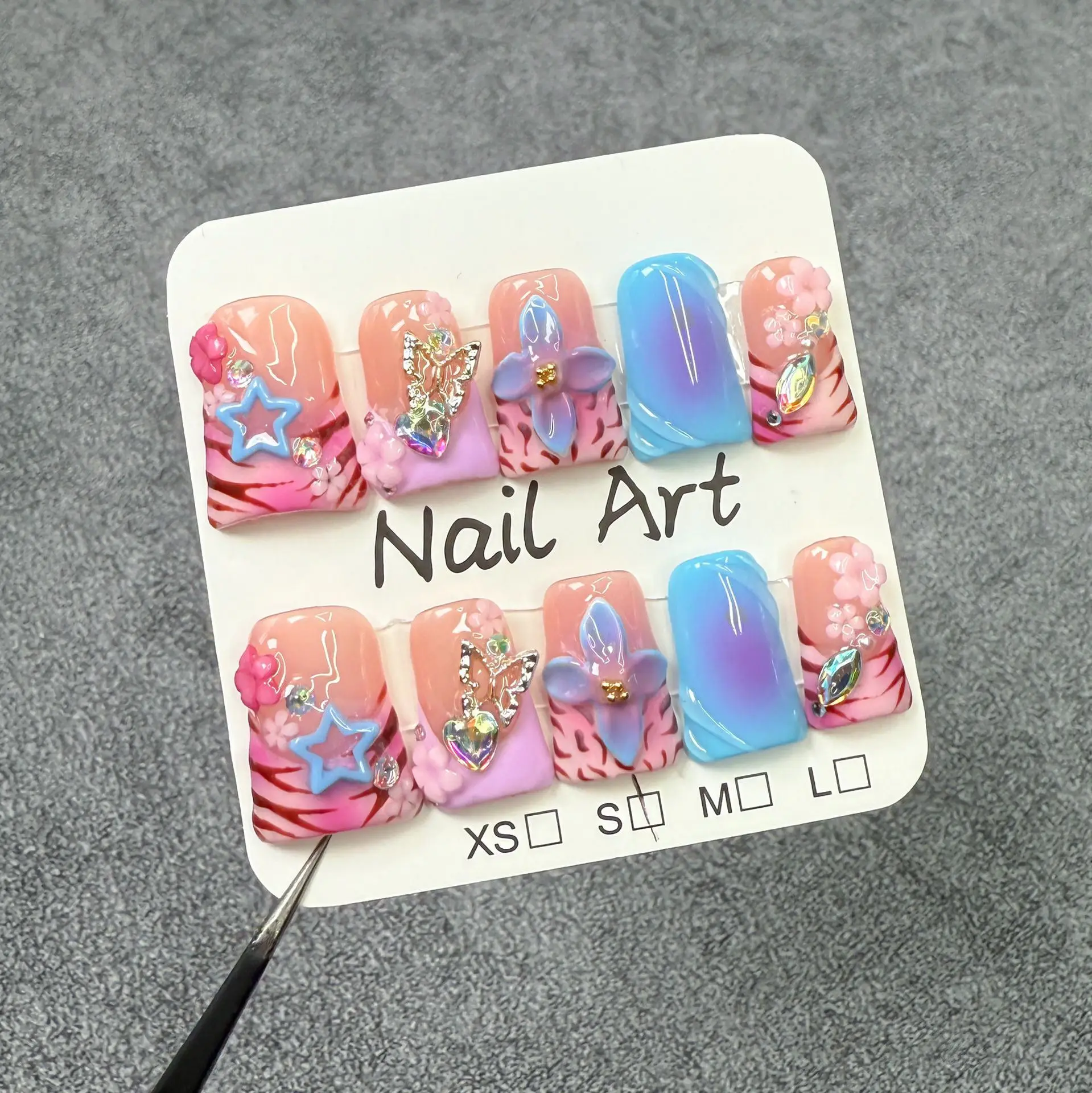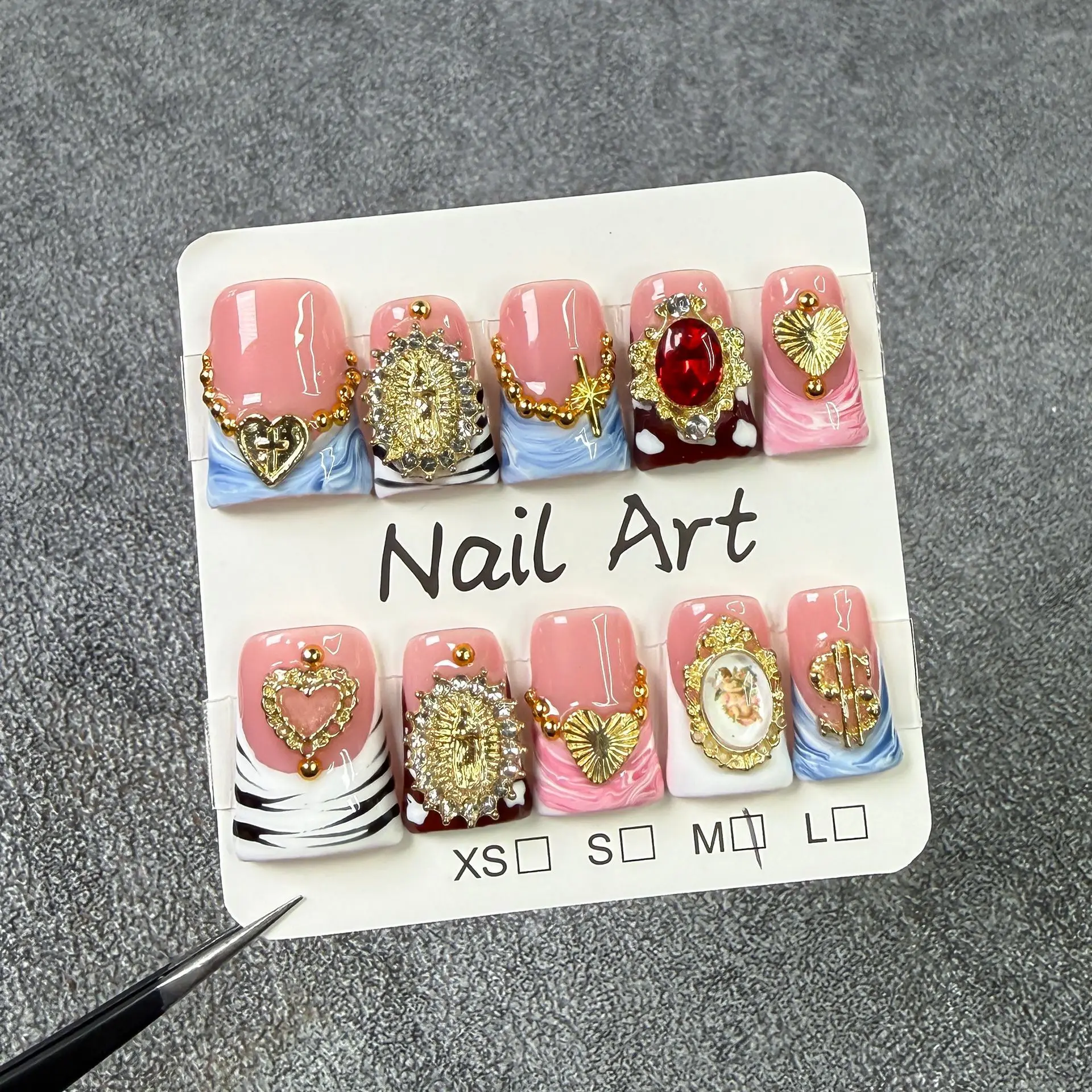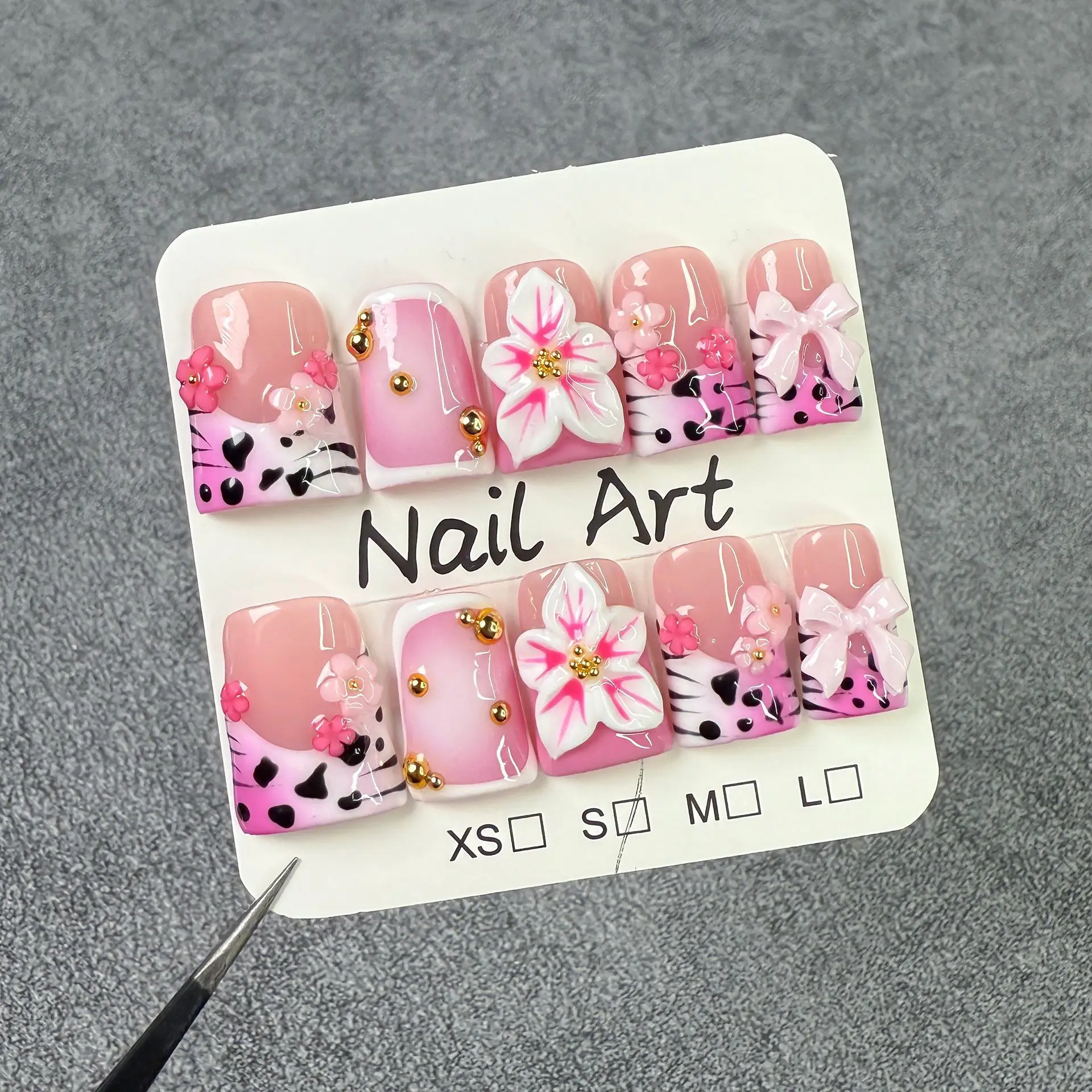 name:   TSZS Leopard Prin Pink French Nail Tips Y2K Style Short Duck Handmade Press on Nails with Spikes Angel Flower Charms Rhinestones