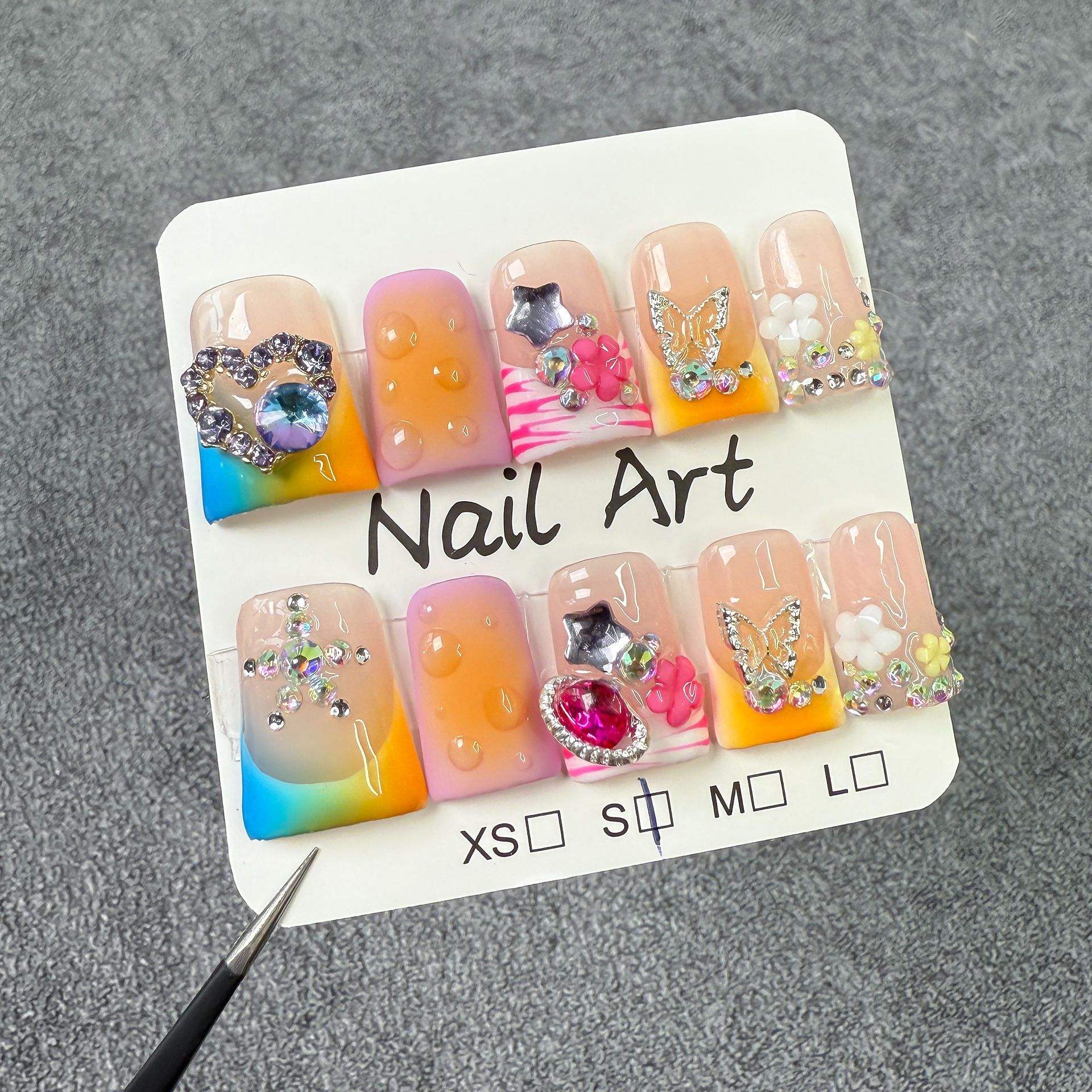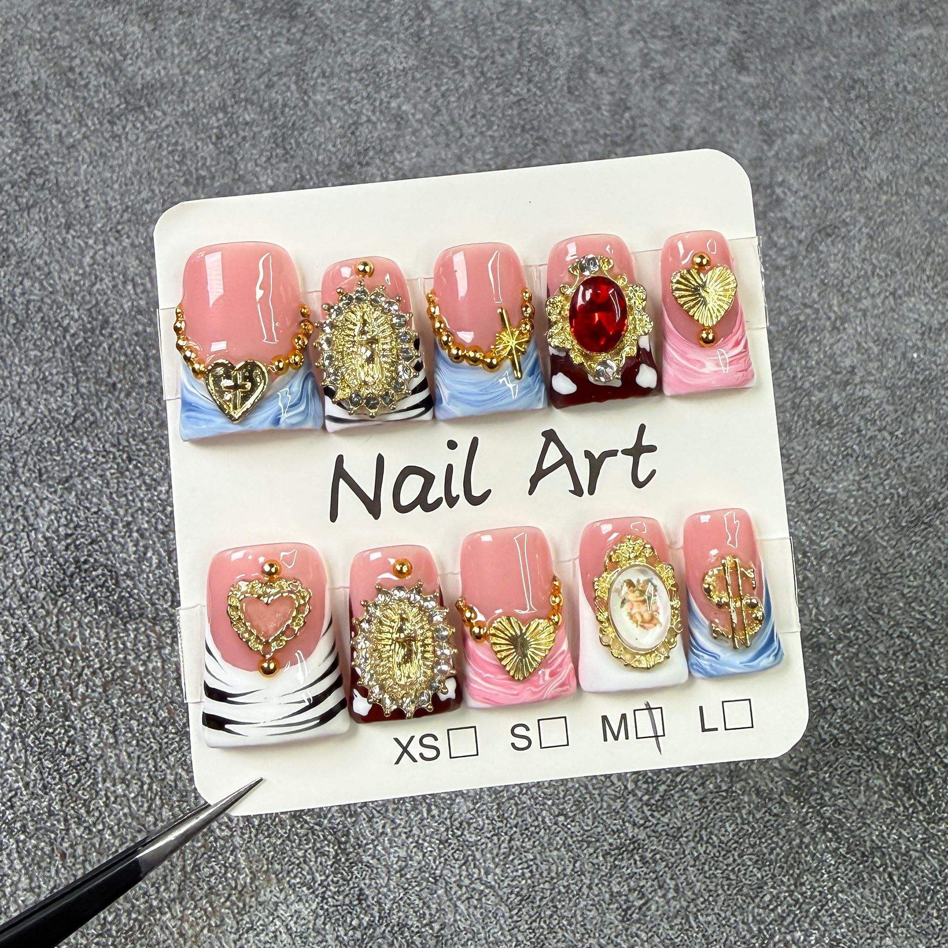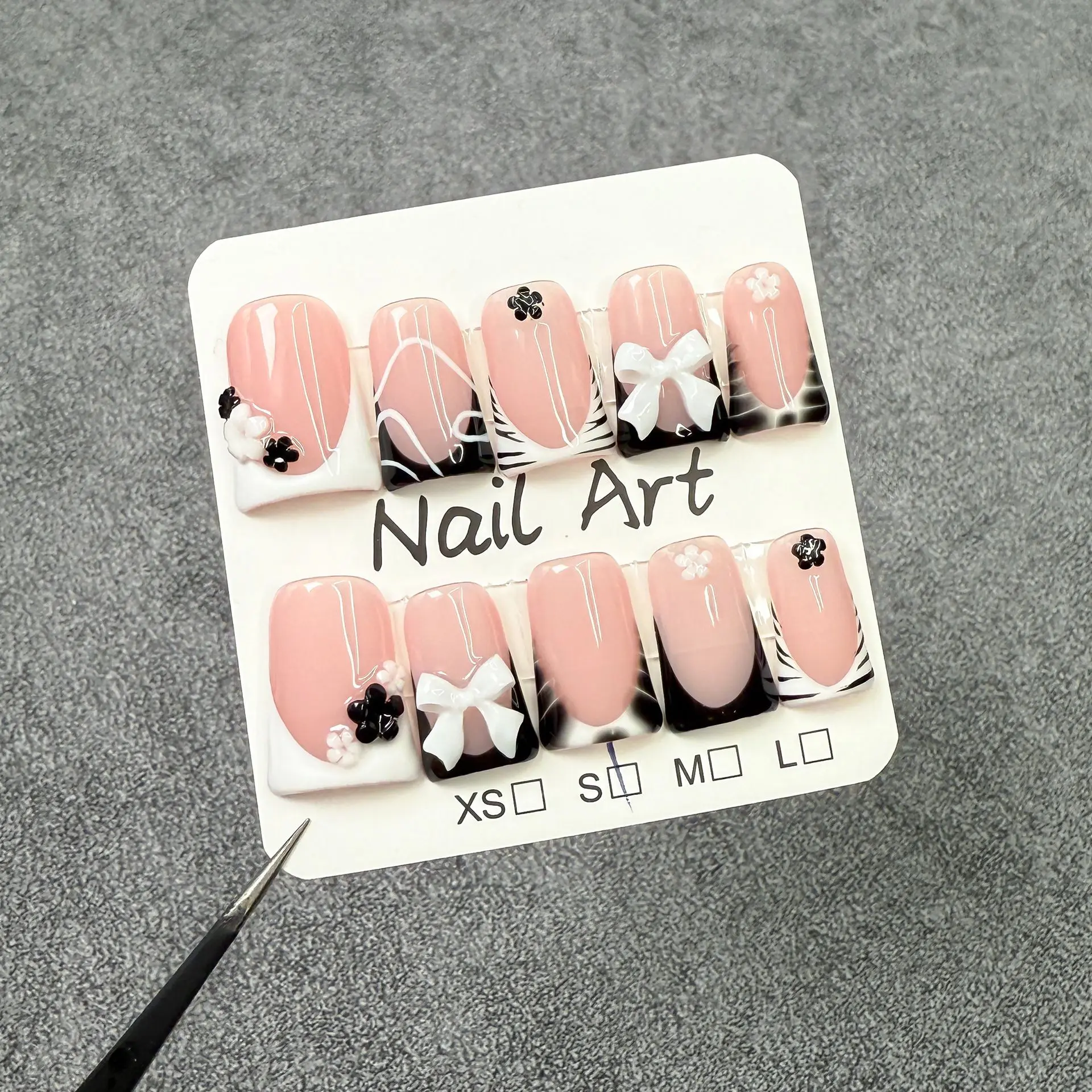 name:   TSZS Leopard Prin Pink French Nail Tips Y2K Style Short Duck Handmade Press on Nails with Spikes Angel Flower Charms Rhinestones