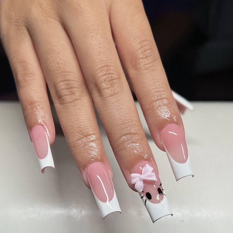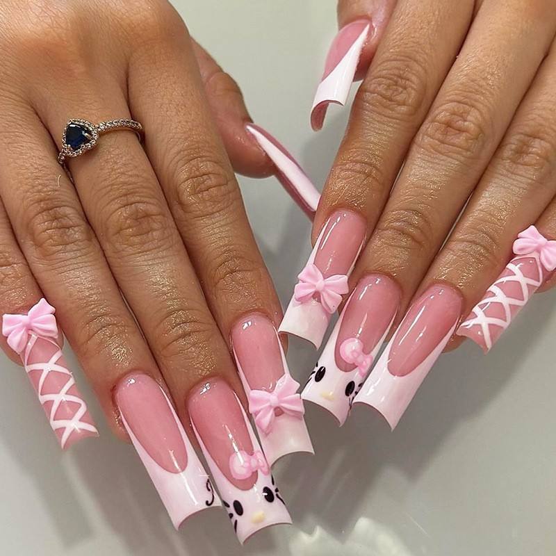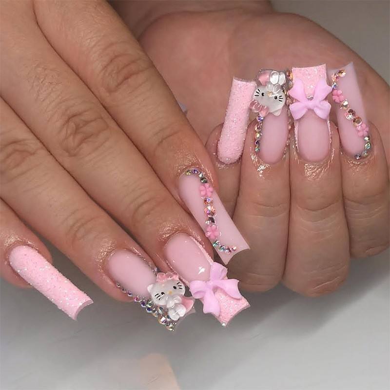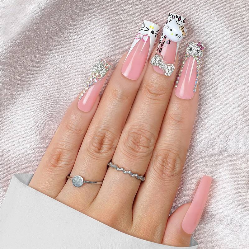 Wholesale 24Pcs Reusable Long Coffin False Nails Bling 3D Hello Kitty Design Press on Nails for Girls